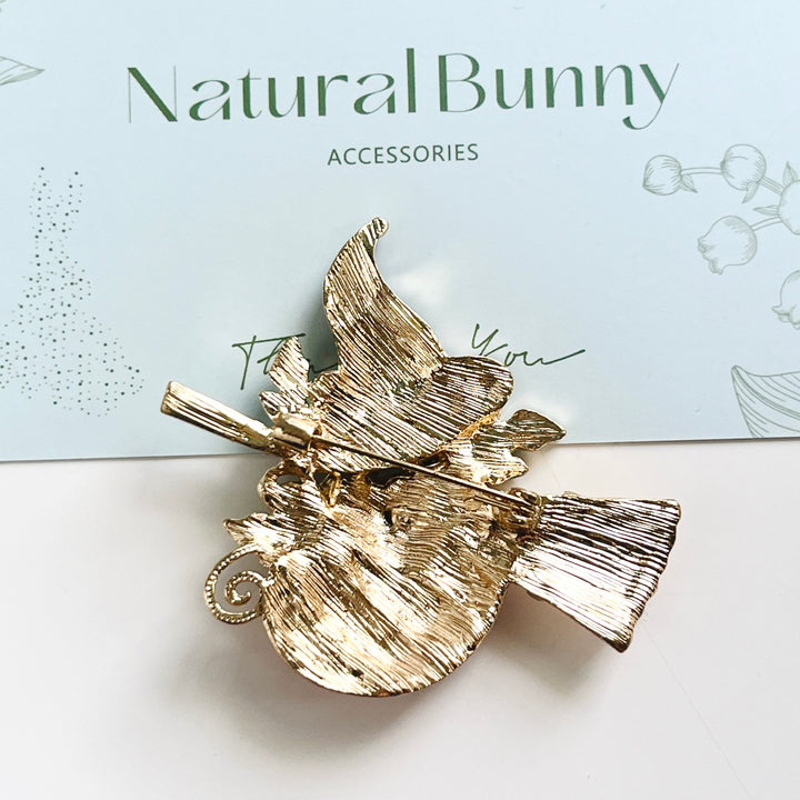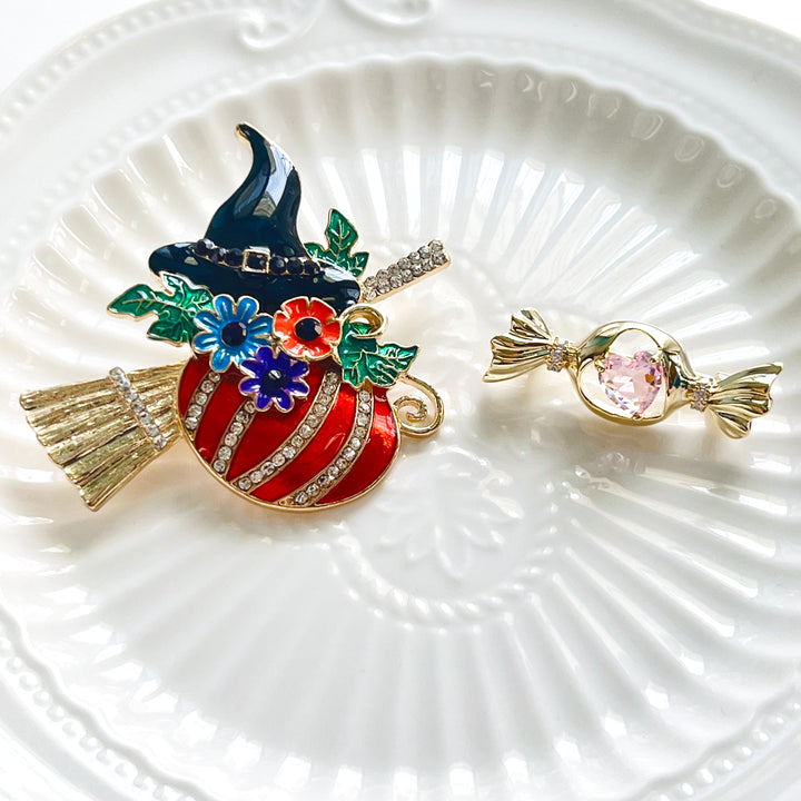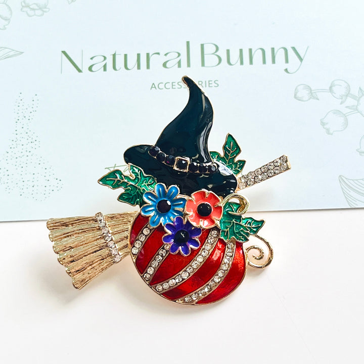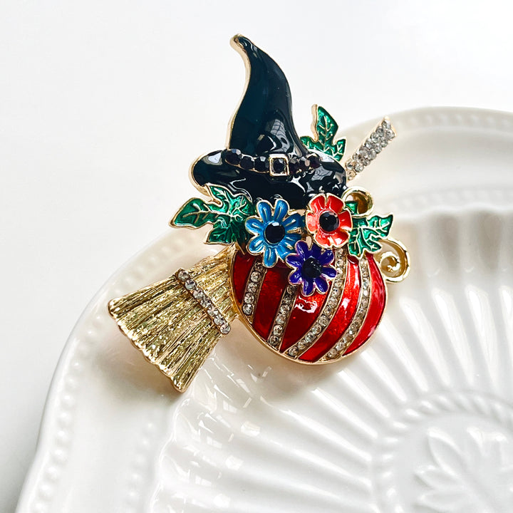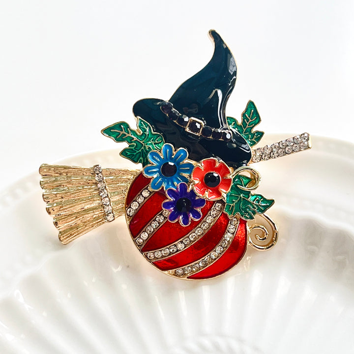 Celebrate the spooky season with the Halloween Pumpkin Witch Brooch, perfectly blending a witch's hat, pumpkin, and broom into one charming accessory.