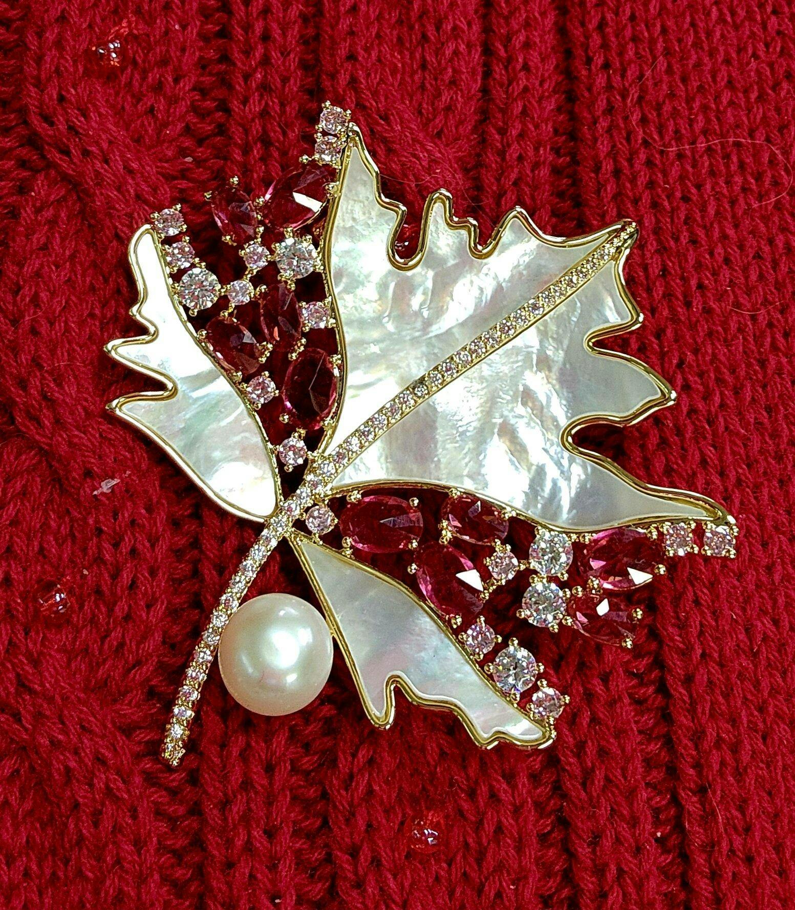 Its delicate mother of pearl finish captures light beautifully, highlighting the intricate maple leaf design. A lone pearl enhances the graceful design with a soft, luminous shine.