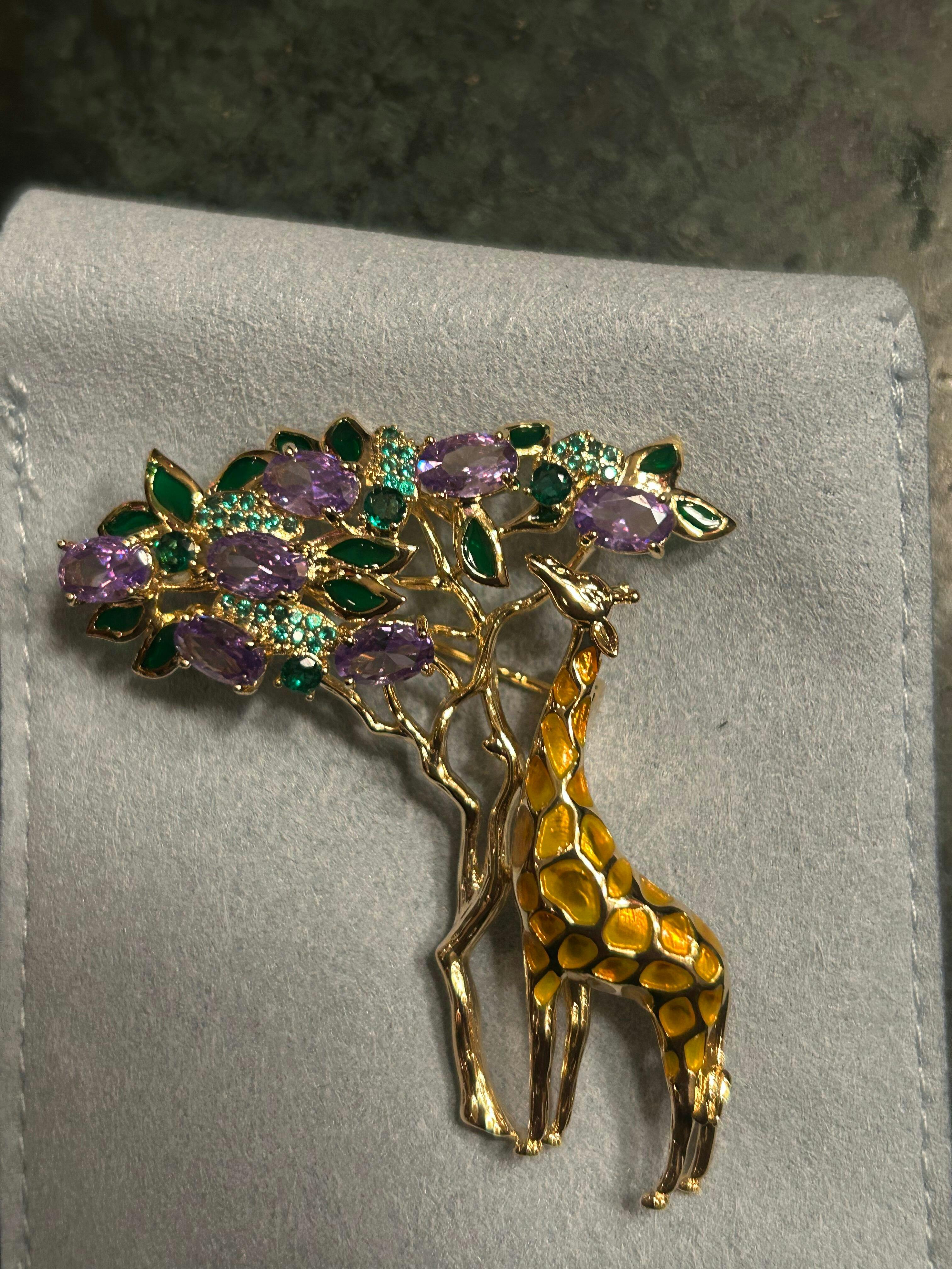 La broche Girafe sous le jacaranda bleu capture magnifiquement une scène paisible d'une girafe debout sous des fleurs de jacaranda bleues vibrantes.