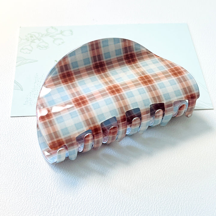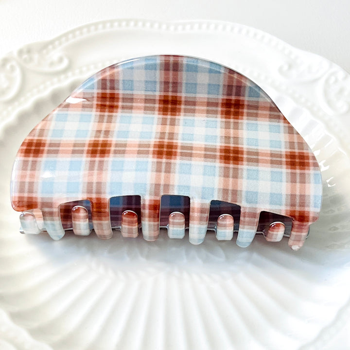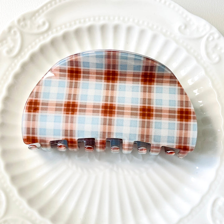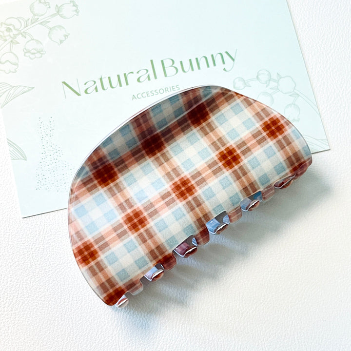 Elevate your autumn styling with this Coffee Time Tartan Hair Claw Clip, featuring a sophisticated blend of warm brown-red and soft light blue in a classic tartan pattern.
