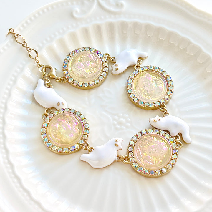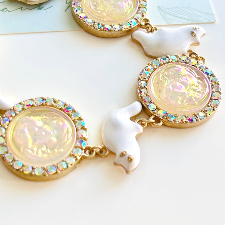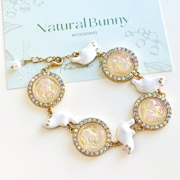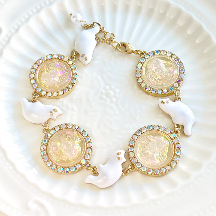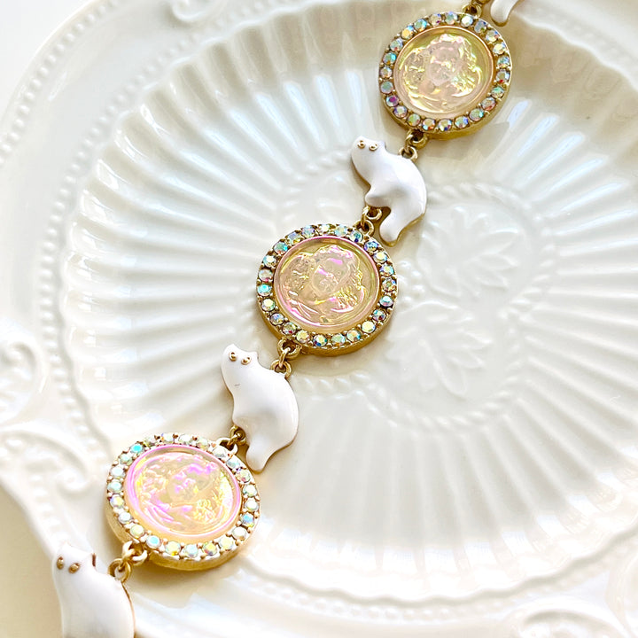 Discover understated elegance with this cameo bracelet, where four white cat shapes alternate seamlessly with four ornamental cameo reliefs. The cat shapes are rendered in clean, recognizable forms that complement the...