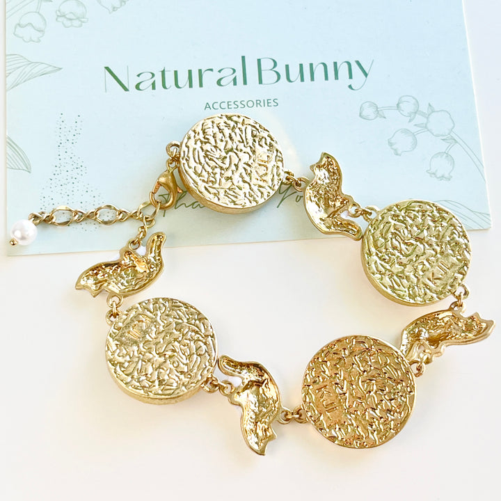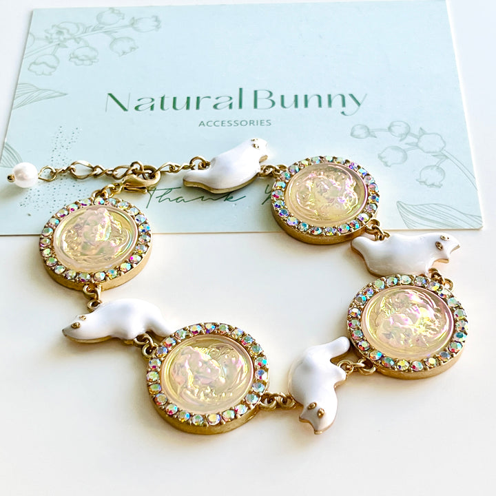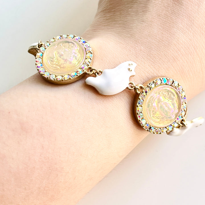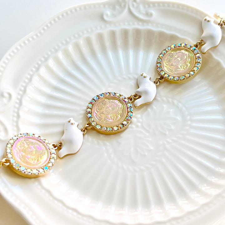 • Discover understated elegance with this cameo bracelet, where four white cat shapes alternate seamlessly with four ornamental cameo reliefs. The cat shapes are rendered in clean, recognizable forms that complement the classical relief work, creating a harmonious rhythm around the wrist.